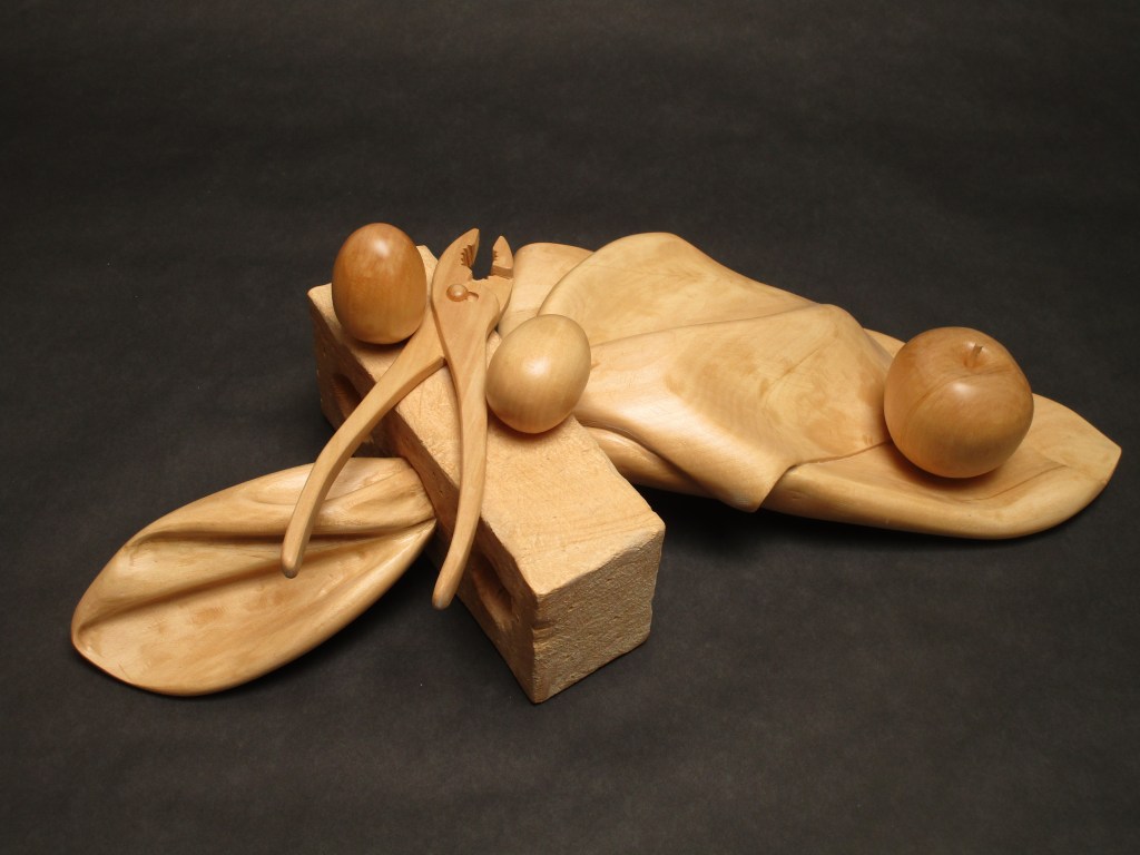 In May, I will be showing 16 new oil paintings and several new wood pieces at the Capitol Contemporary Gallery in Boise. My emphasis this time is on still life subjects. Some of the compositions are fairly complex, like “Arrangement in White and Black”, 30 x 40. Others are simpler studies of fruit and vegetable forms, greatly enlarged. The wood pieces combine natural and man-made objects with contrasting forms and textures, like “Pulled Through”, shown below. The show opens on First Thursday, May 4, 5-8pm, and continues through the month of May.