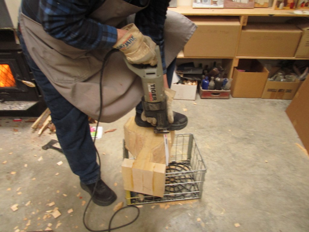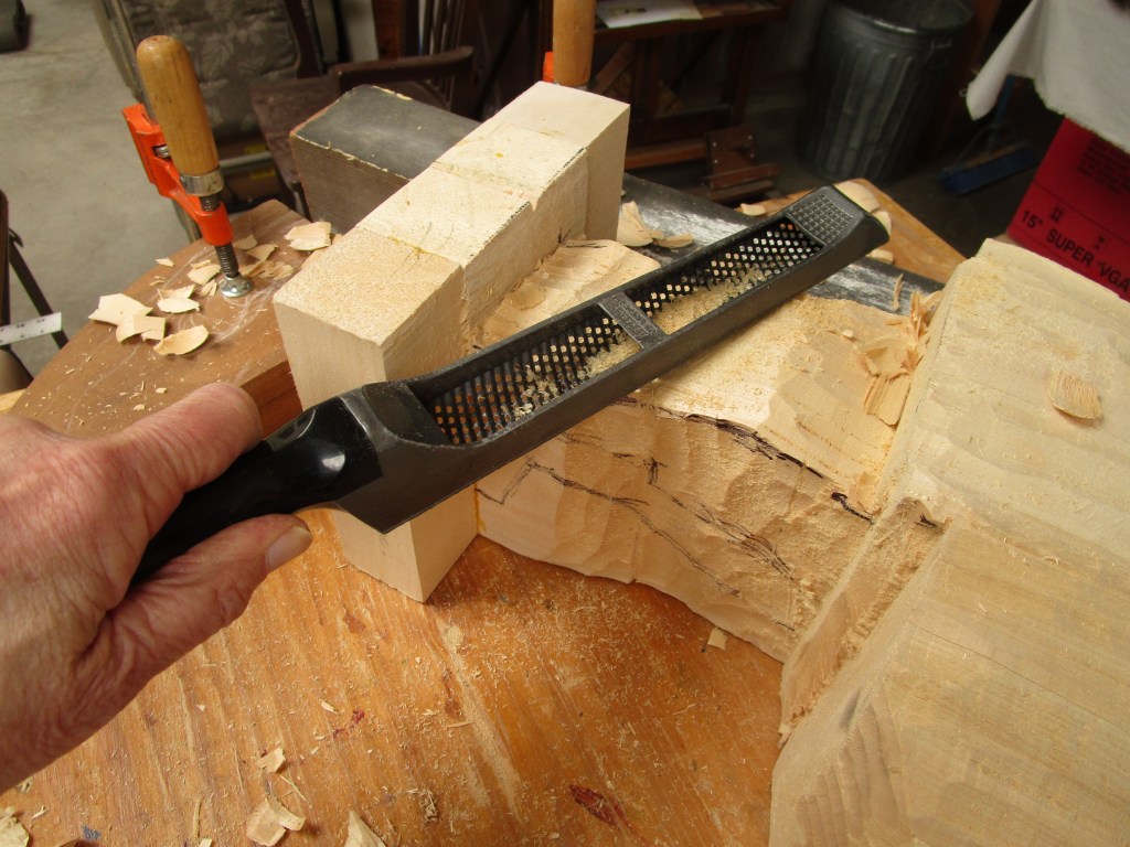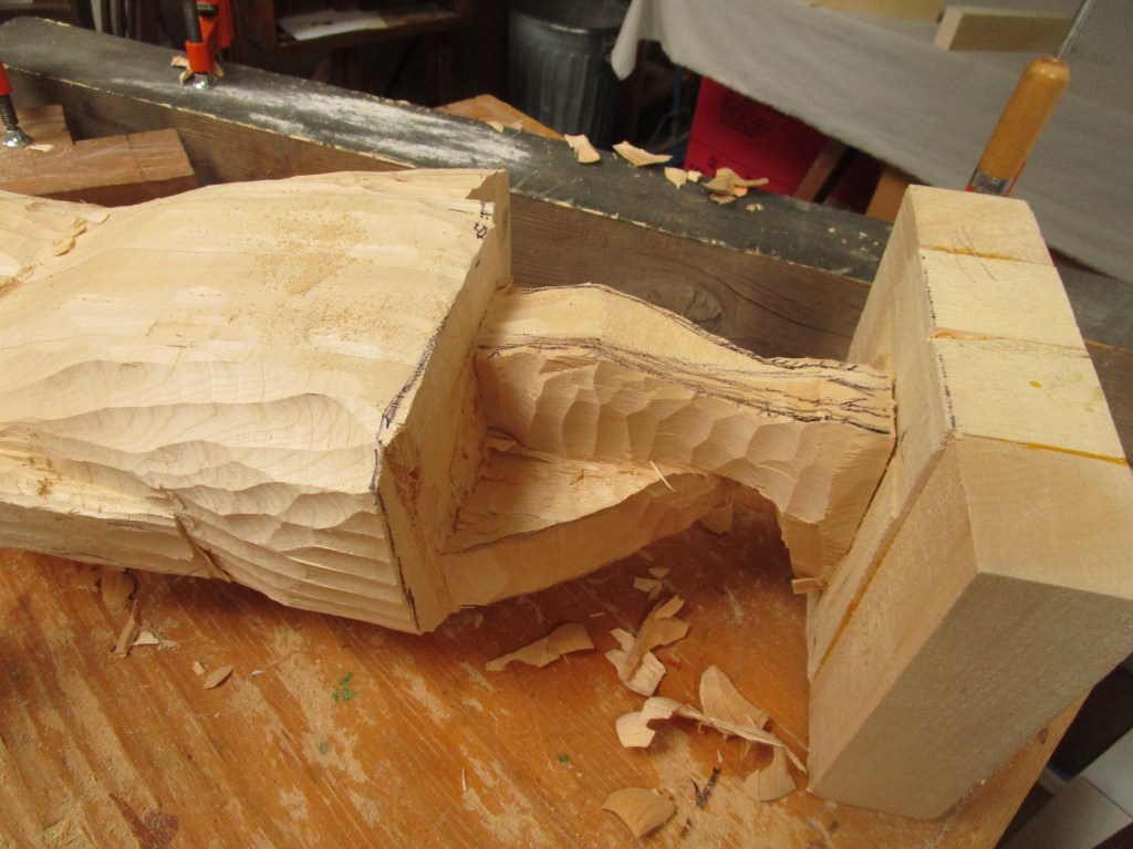 The right arm has been partially roughed out. The size of the wood chips on the table indicate about how much is being removed with each cut. This kind of sculpture is a “subtractive” art, and one has to be careful not to take away too much, as it can’t be put back!