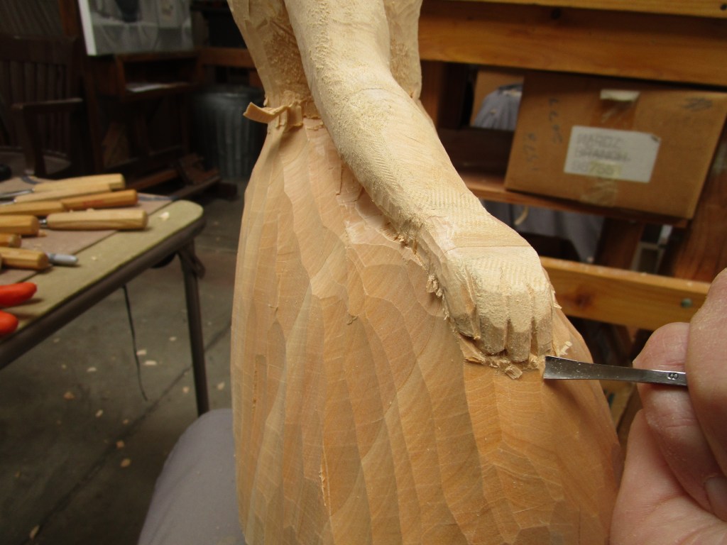 The arm and hand further refined. A small gouge is used a lot at this stage of the carving.