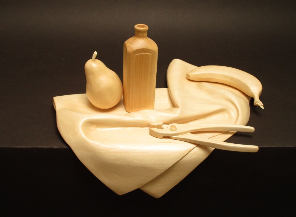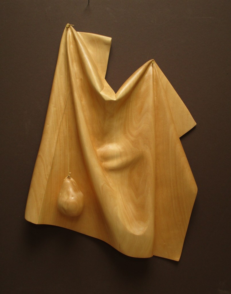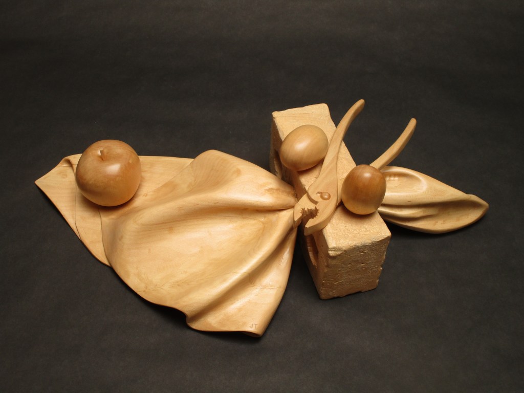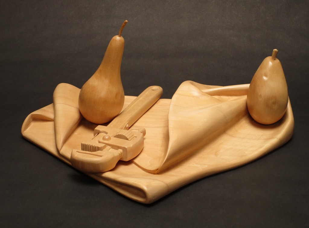 Wood Sculpture Interlude, basswood, 26″ high Still Life with Pliers, Basswood, 18 x 14 x 7.5 Drapery and Pear, Basswood, 26″ high Pipe Wrench and Pears, Basswood, 18 x 16 x 8 Balance, Basswood/oil paint, 15” high Marriage of Opposites, Basswood/acrylic paint, 18” high Pulled Through,Basswood “Bird Bowl”Cherry, 18 x 18 x 6 Bricks and Friends,Basswood and acrylic Three-legged Bowl, 16 x 16 x 10 Emblems, Alder, 24” long Still Life, Basswood, 13” long Banana Plate, Basswood, 14” long Yoga Figure, Basswood/acrylic paint, 20” high En Pointe, Cherry/acrylic paint, 32” high Reading , Basswood, 20 “ high Portrait Study, Basswood, 14” high Dark Torso walnut, 29″ high Wandering Sheep, Walnut, maple, bronze, 36” long Wandering Sheep (detail) Related