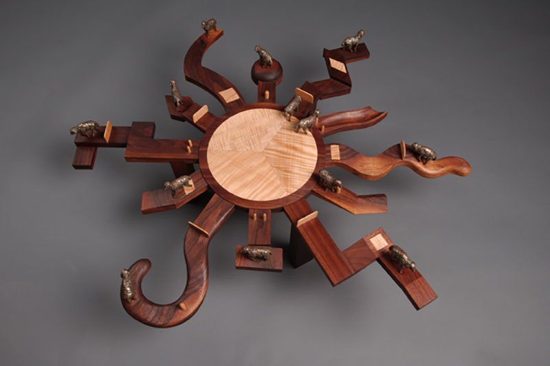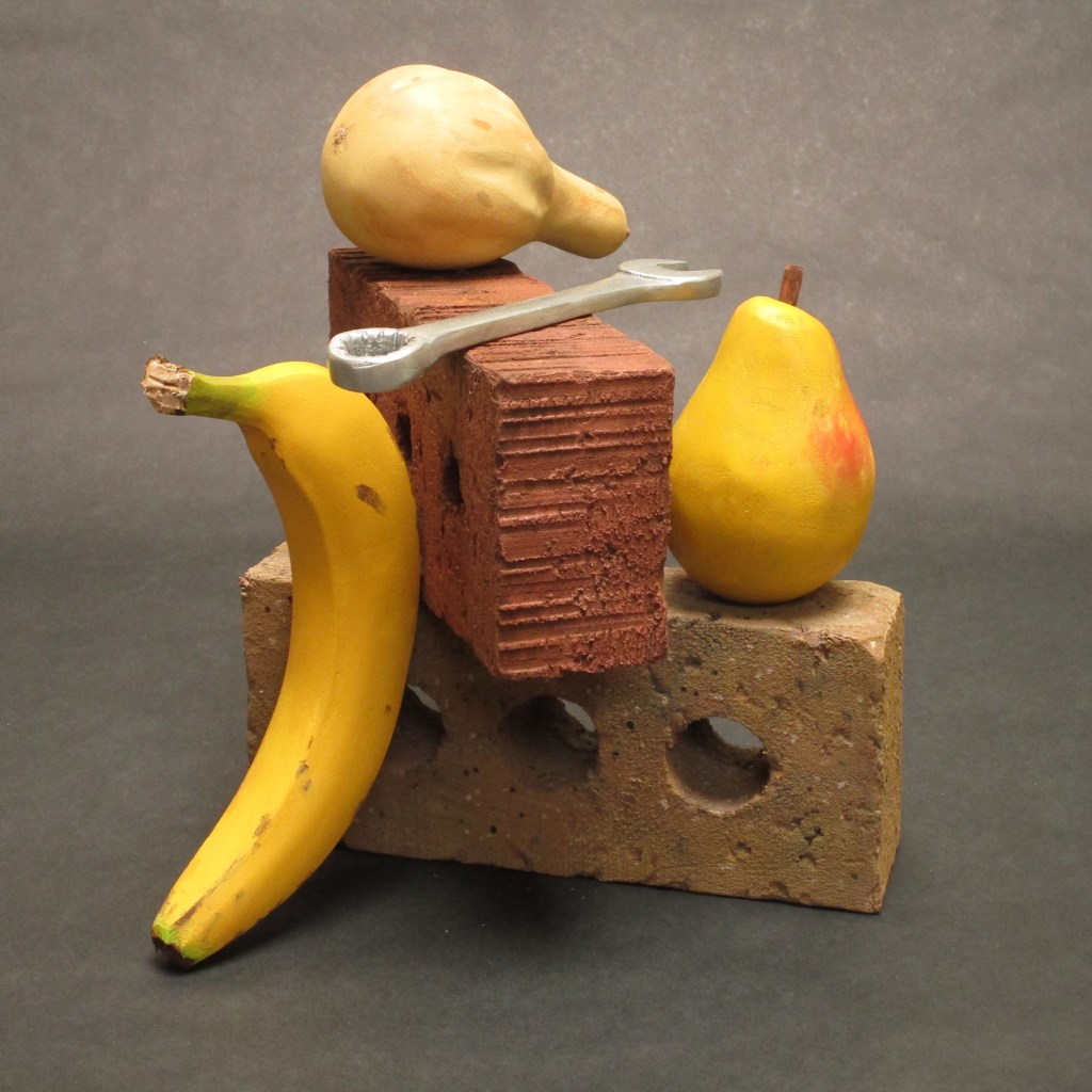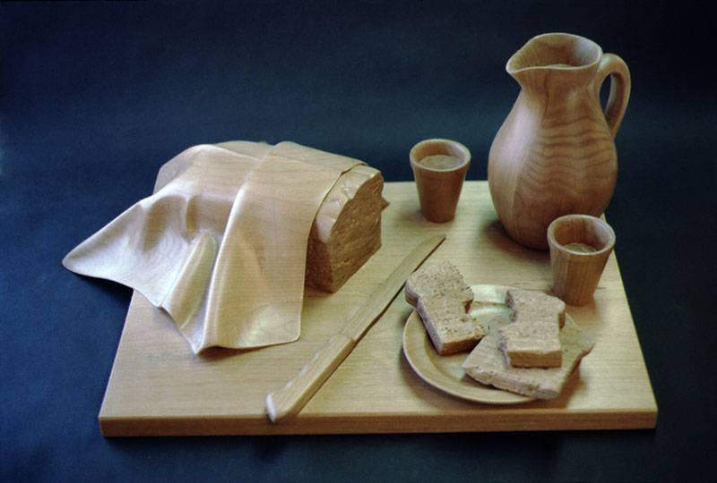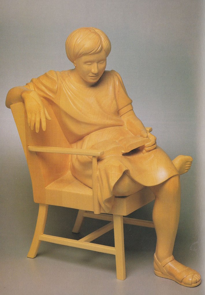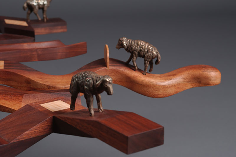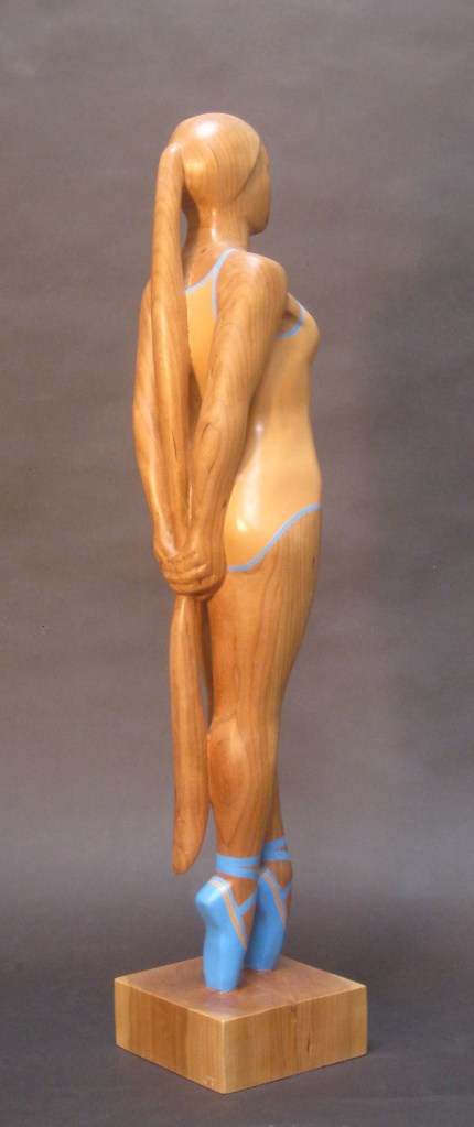 Wood Sculpture Interlude, basswood, 26″ high Still Life with Pliers, Basswood, 18 x 14 x 7.5 Drapery and Pear, Basswood, 26″ high Pipe Wrench and Pears, Basswood, 18 x 16 x 8 Balance, Basswood/oil paint, 15” high Marriage of Opposites, Basswood/acrylic paint, 18” high Pulled Through,Basswood “Bird Bowl”Cherry, 18 x 18 x 6 Bricks and Friends,Basswood and acrylic Three-legged Bowl, 16 x 16 x 10 Emblems, Alder, 24” long Still Life, Basswood, 13” long Banana Plate, Basswood, 14” long Yoga Figure, Basswood/acrylic paint, 20” high En Pointe, Cherry/acrylic paint, 32” high Reading , Basswood, 20 “ high Portrait Study, Basswood, 14” high Dark Torso walnut, 29″ high Wandering Sheep, Walnut, maple, bronze, 36” long Wandering Sheep (detail) Related